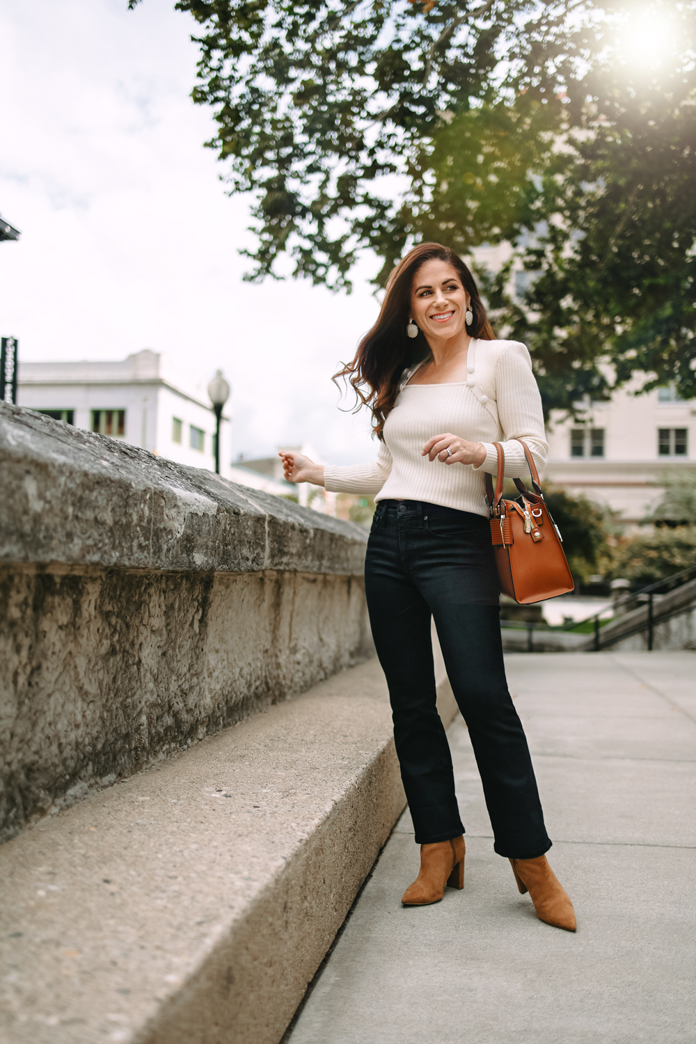 Its petite kickout crop jean is my favorite, ideal with cute boots for fall. But I also adore the petite perfect vintage wide leg jean! Though trendy, wide leg jeans can be challenging for shorter frames. I offer styling tips on choosing flattering wide leg denim in this post. These fit like a dream, no alterations required. Note: I wear both styles with a moderate heel.