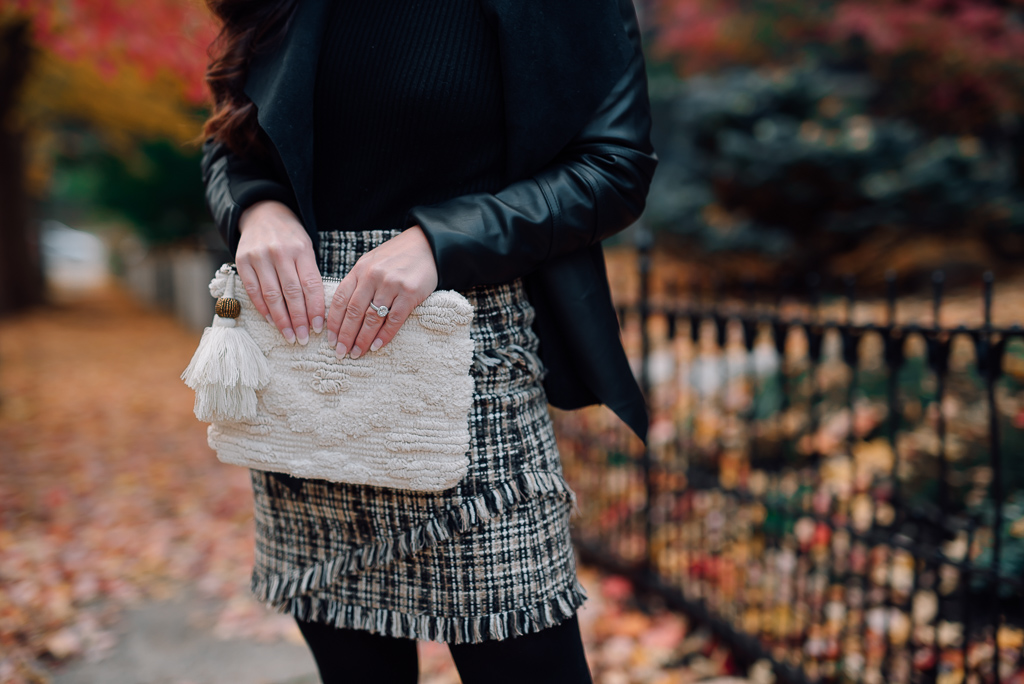 Flyaway Faux Leather Jacket | Tasseled Tweed Skirt | Tassel Earrings | Bell Sleeve Turtleneck (similar) | Black Pumps
