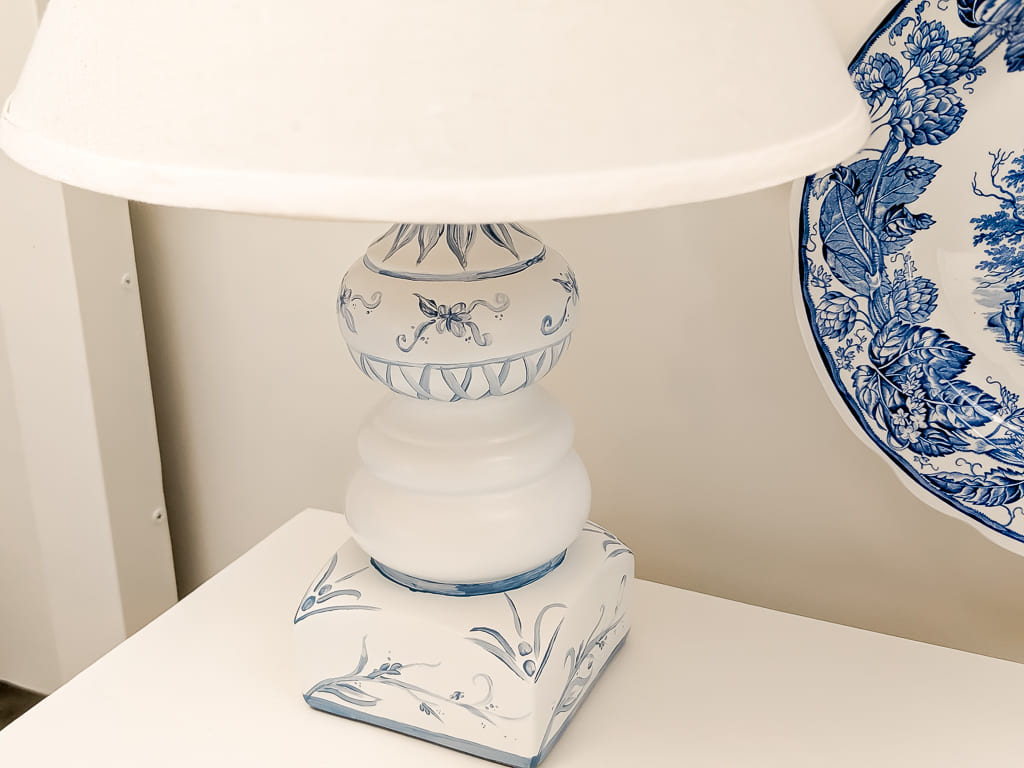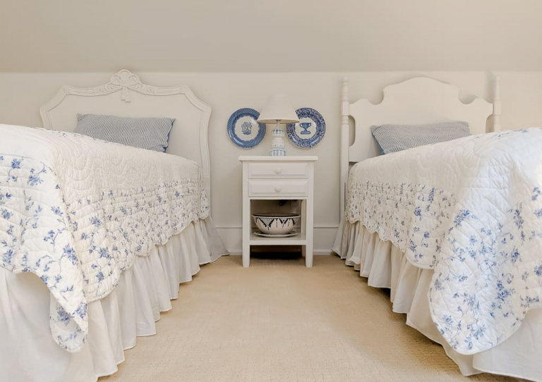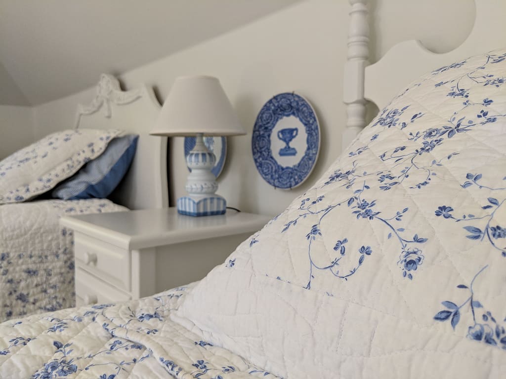My family loves the water, so our cottage has an understated nautical vibe. Consequently, a blue and white theme felt natural. My mom (the trained designer of the family) pulled inspiration for the space from her porcelain collection, which includes beautiful plates and vases like these. We even duplicated the porcelain look with a DIY lamp project (more on that below). However, the real “glue” that holds this room together is its assortment of twin headboards.