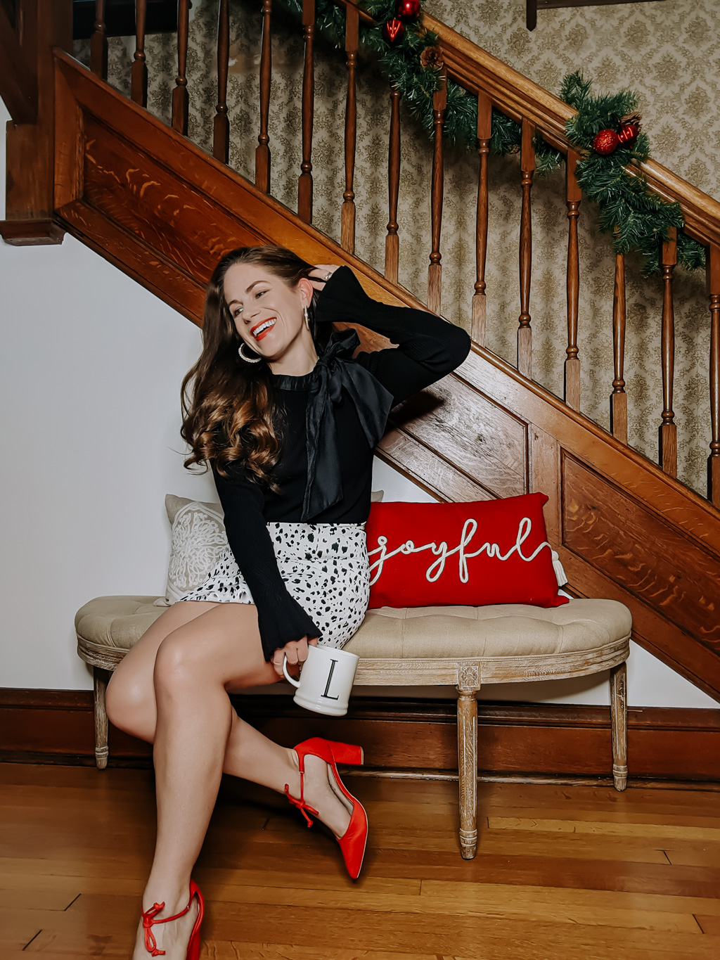 For my fashionista friends… My outfit is a Chicwish find. The skirt is a true mini length (even for petites – I’m 4’11) and the top is so gorgeously festive. It’s a high quality knit with slight bell sleeves (also available in white, ivory, and pale pink). I didn’t iron the bow, but should have. Blame busy mom life, lol! Check the link, so you can see what it’s supposed to look like.