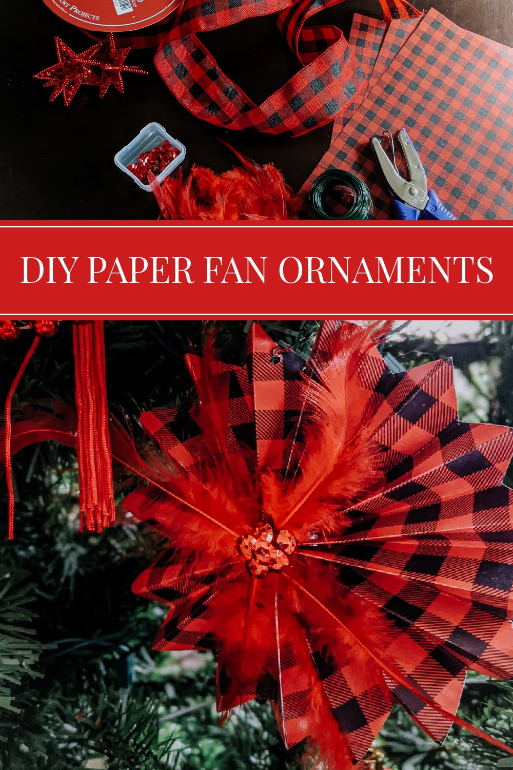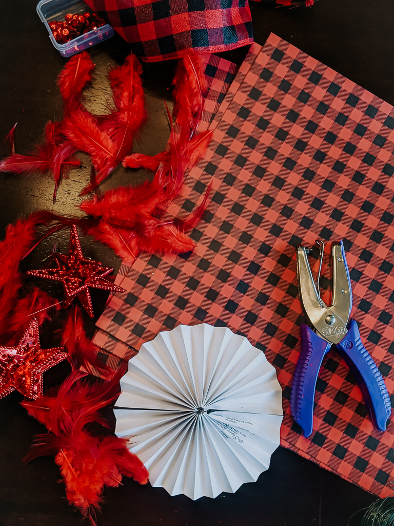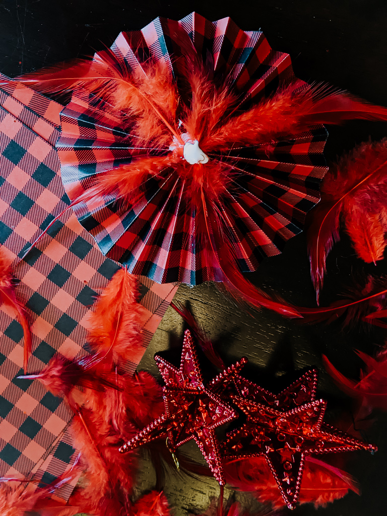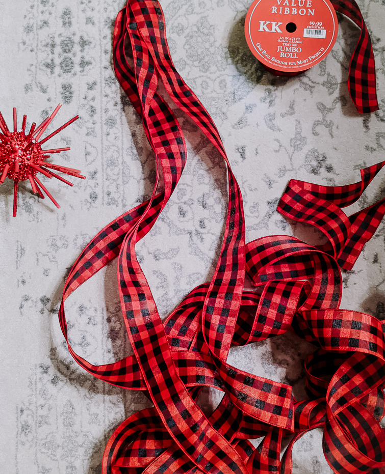 I hadn’t intended on doing a new Christmas color scheme this year, but the little guy requested a red tree. Red is his favorite color and mama aims to please! However, ornaments can get expensive. I wasn’t about to splurge on all new ornaments after buying new last year (see last year’s display here). So, we decided to get crafty and do some DIY Christmas ornaments. Our jumping off point this year was a buffalo check ribbon.