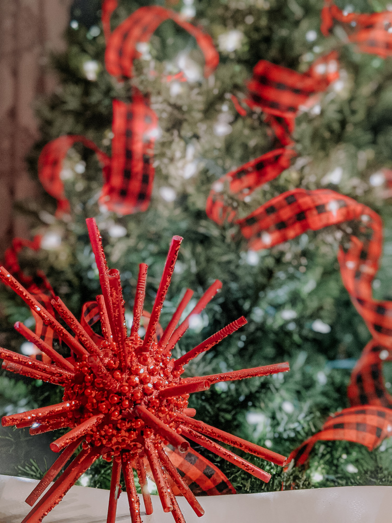 Finally, the “glitter globes” Styrofoam/straws ornament. Yeah… I know what you’re thinking. Doesn’t this look like the virus? Yup, red was a bad choice. However, in any other year, these add such punch and impact to your tree. They are VERY eye catching and great for filling any natural wholes your tree may have.