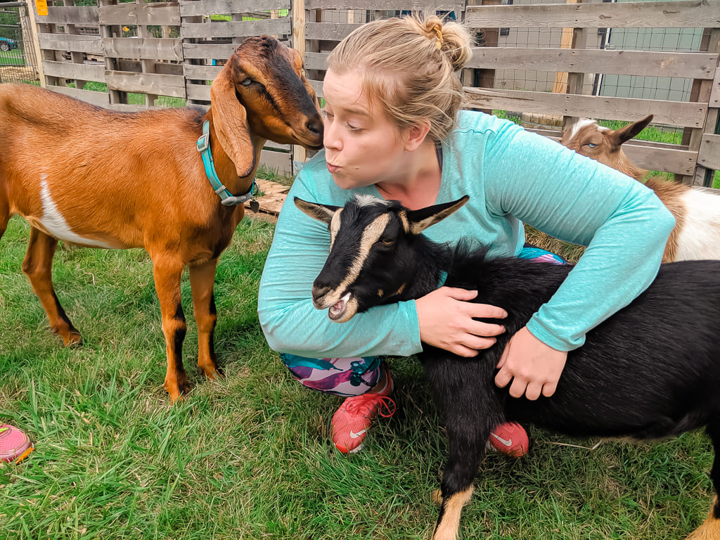 First, the farm is gorgeous! It sits on the edge of beautiful wetlands, where you’ll hear birds and wildlife providing a chorus from sunrise to sunset. Reverse the Kerrs has nine goats, plus precious babies. How adorable is this little guy below? All of the goats are genuinely excited to interact with people.