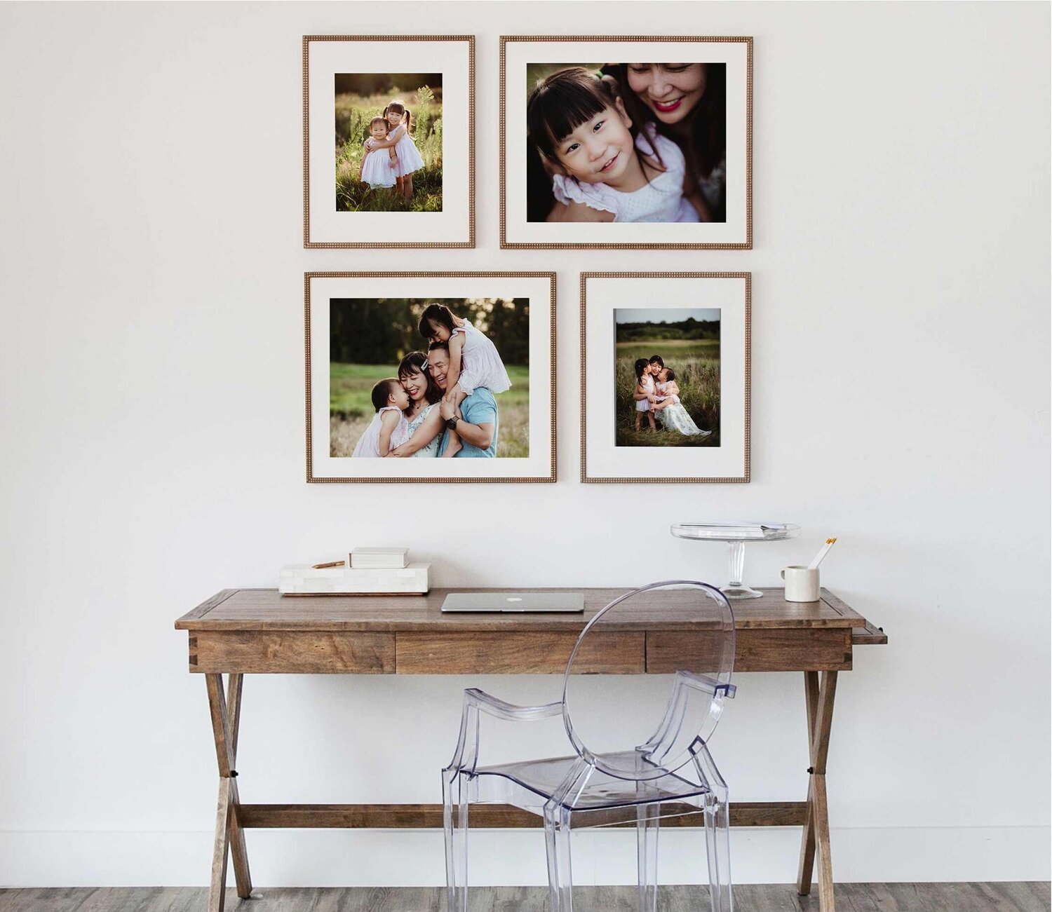You can go with a single large image, pair two 16×20 photos side-by-side in coordinating frames, or fill an entire wall like my friend Hoang-Kim did above. She used Framebridge to customize a full gallery.