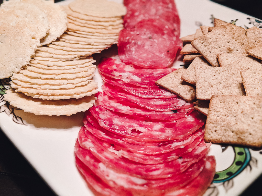 To keep thing simple, I opted for a dark chocolate snack mix from Target. It had nuts, dark chocolate covered espresso beans, and other exceptionally tasty treats. Additionally, don’t forget about the crackers. You will want a fun assortment. While I served my old standby of Wheat Thins, I also picked up a few artisan options. Another tip: Don’t let your toddler devour all the salami before your visitors arrive. Little dude ate half the package!