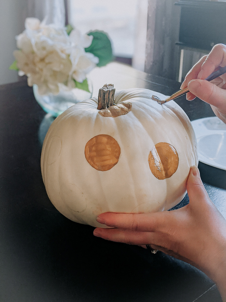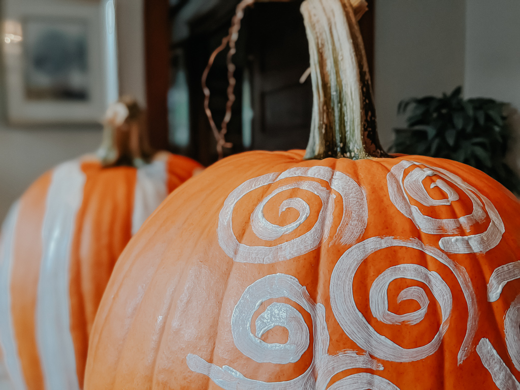 If you look closely below, you will see my plaid pumpkin was a bit of an oops moment… To get this design to work properly, you need to paint curved lines, so you follow the natural shape of the pumpkin right into the stem. I attempted to keep my lines straight running around the pumpkin. It just doesn’t work that way! In my defense, I was a bit distracted while painting that one. Hudson was working on his pumpkin at the same time and thought it would be fun to paint his face too, lol. But I digress…