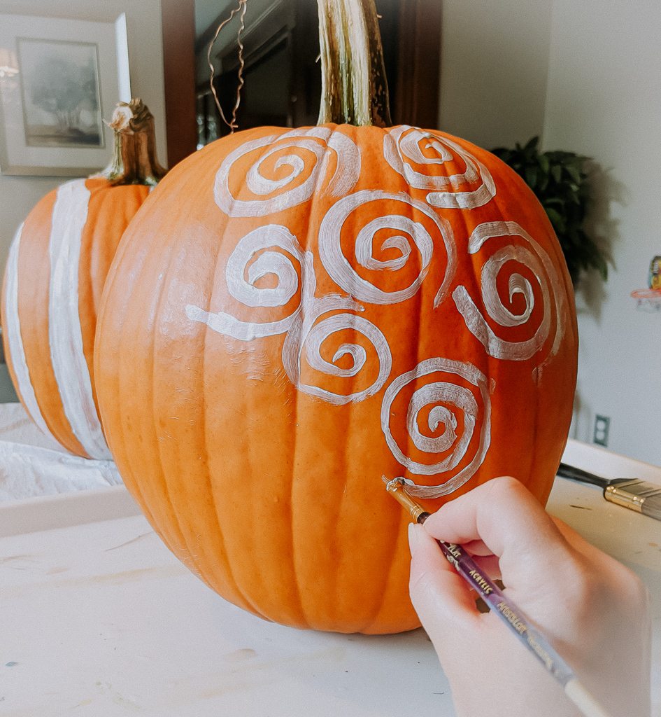 Be sure to extend your swirls up to the top and down to the bottom of your pumpkin. I also occasionally varied the direction of my swirls. Keep in mind, you will probably need to let part of your pumpkin dry, so you can gain access to the top and bottom without smearing what you’ve already painted. I didn’t try this method, but I’ve seen several people recommend using thumb tacks (5-10 poked into the bottom of the pumpkin) to prop it up off the ground for drying purposes. Smart idea, right?