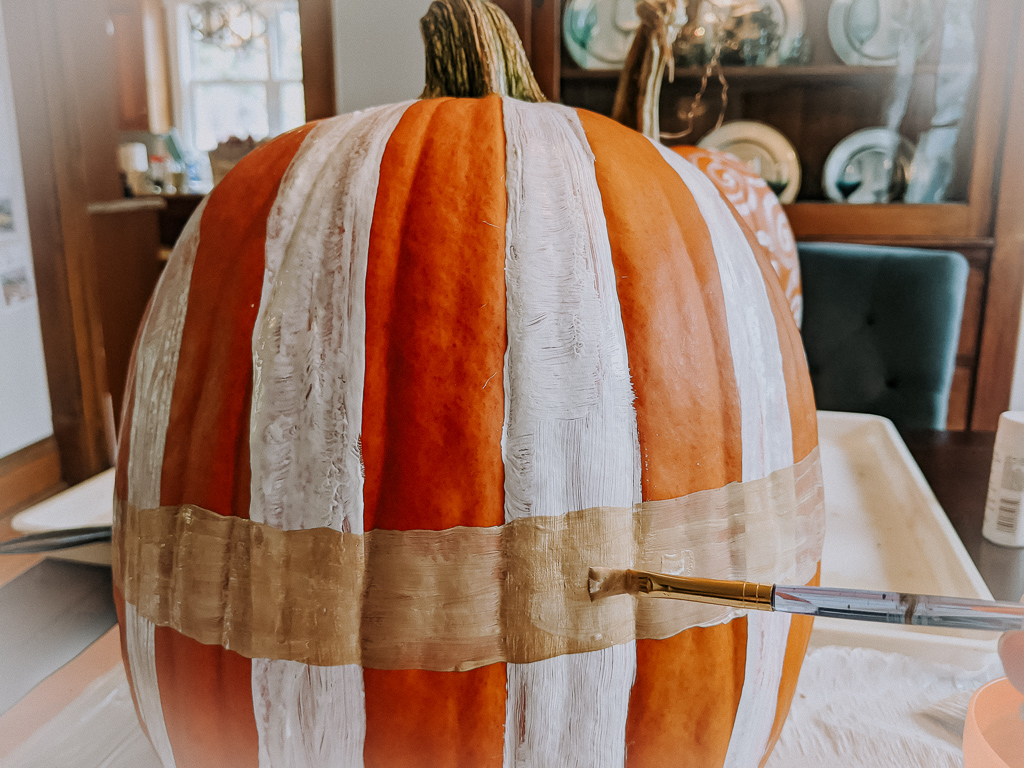 To achieve a plaid or buffalo check look, you will want to paint vertical lines that are similar to the striped pumpkin I did below. Once you have the vertical lines complete, you need to add a few horizontal lines wrapping around the pumpkin.