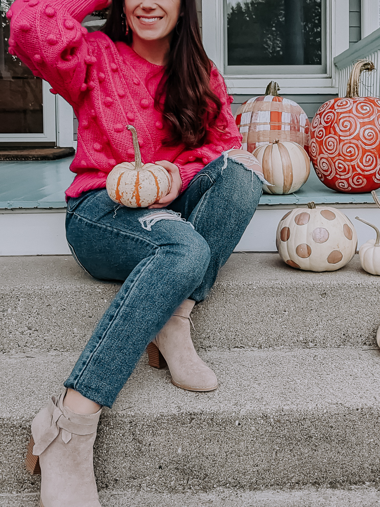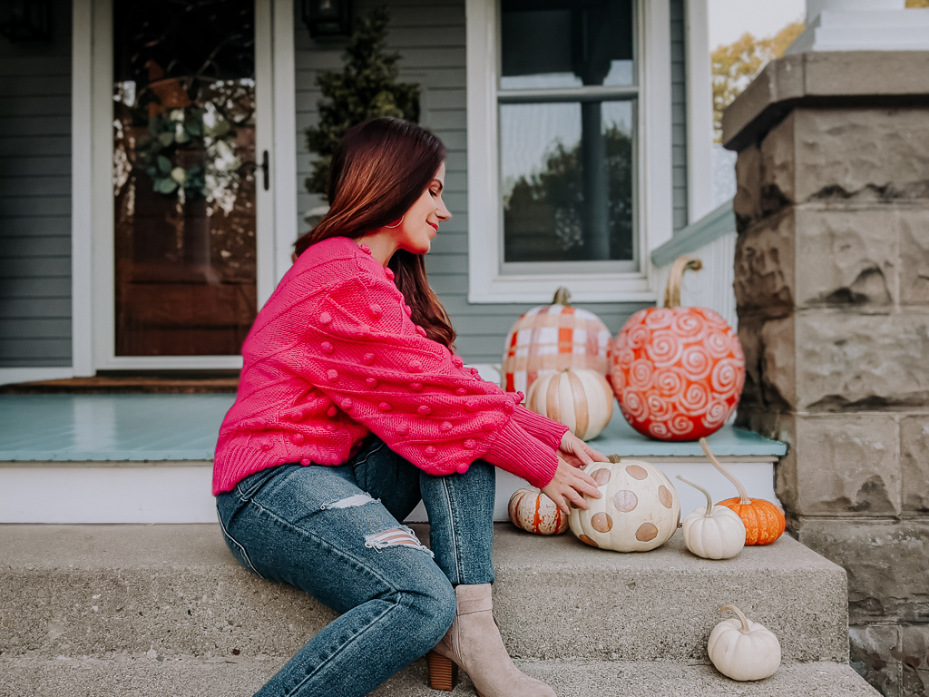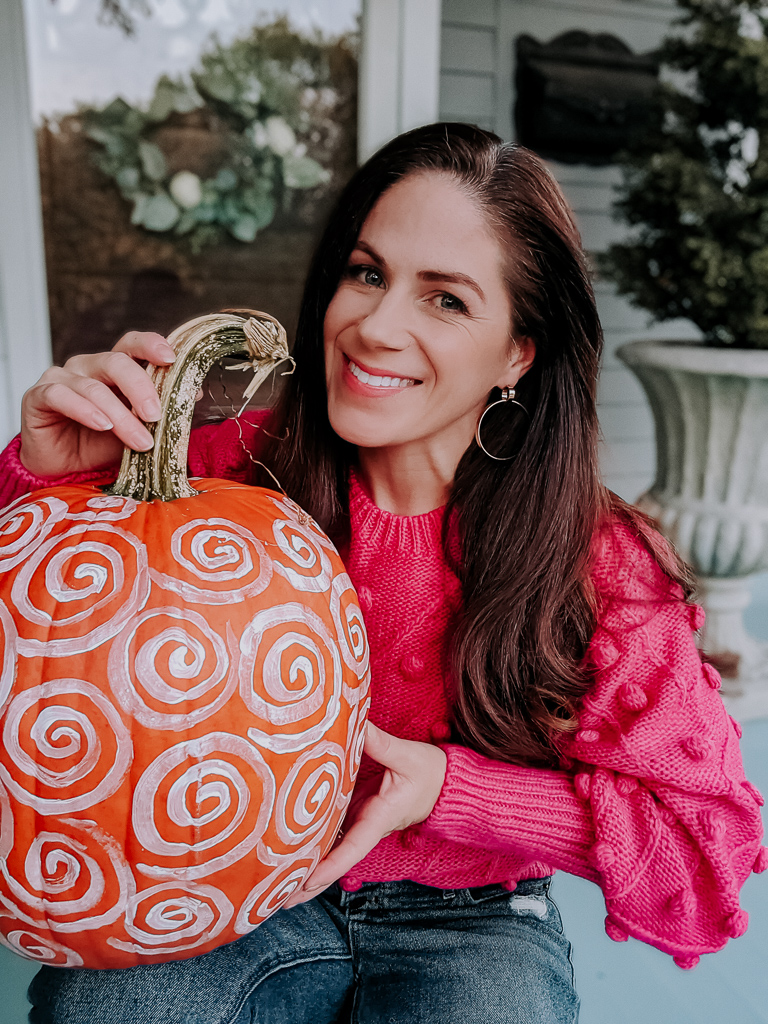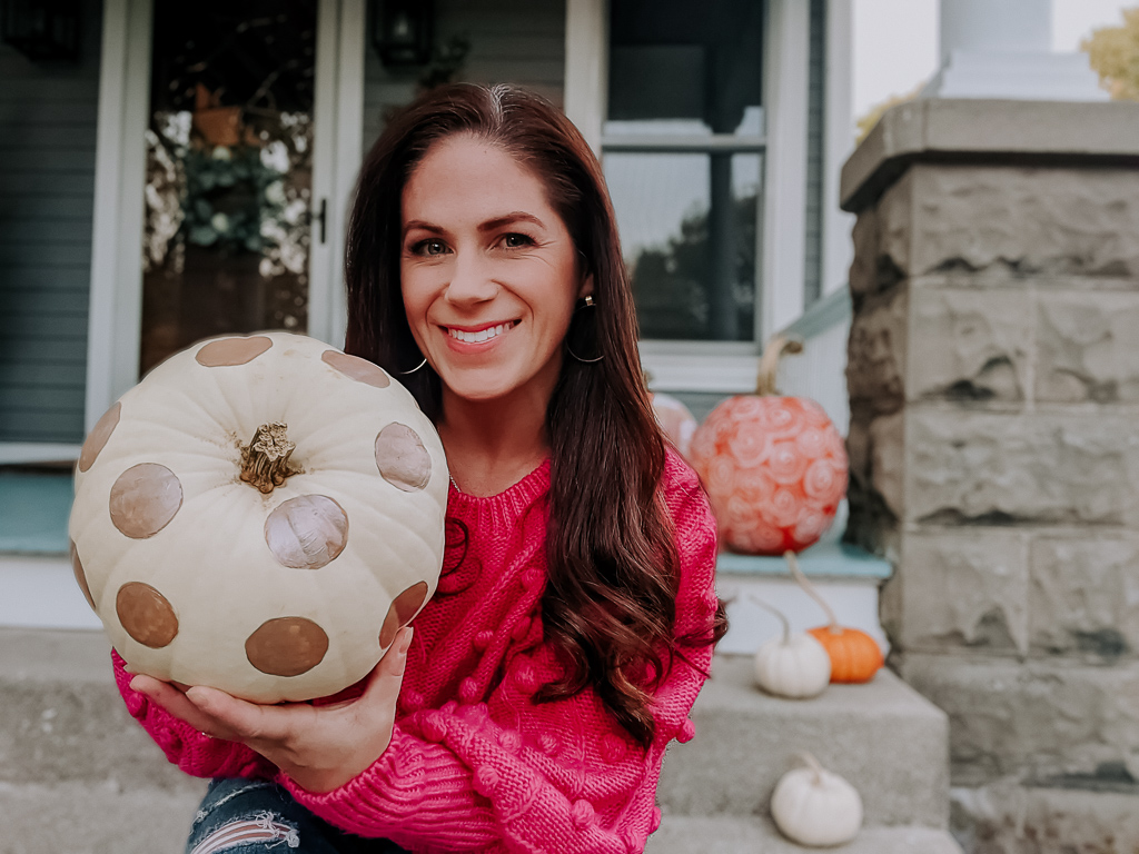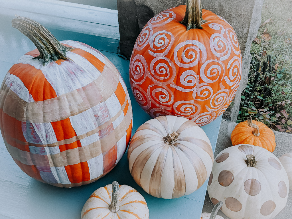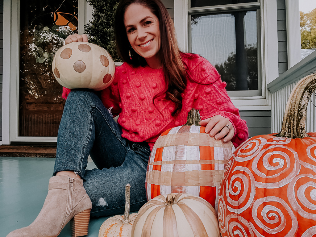 Anyone else feel a bit behind this season? It’s like I blinked… and we suddenly morphed from summer to Halloween! Fall has always been one of my favorite seasons to decorate for—and while I love carving pumpkins—I wanted a few porch options that would work past Halloween. I always get so sad when those carefully carved faces start to droop. Wouldn’t it be nice if you could have that “styled” porch look beyond spooky season? Enter the painted pumpkin! This décor is fitting for Halloween and fall harvest. It offers that Thanksgiving vibe, you can really keep around. So, here are a few painted pumpkin ideas to try from plaid to polka dot…
