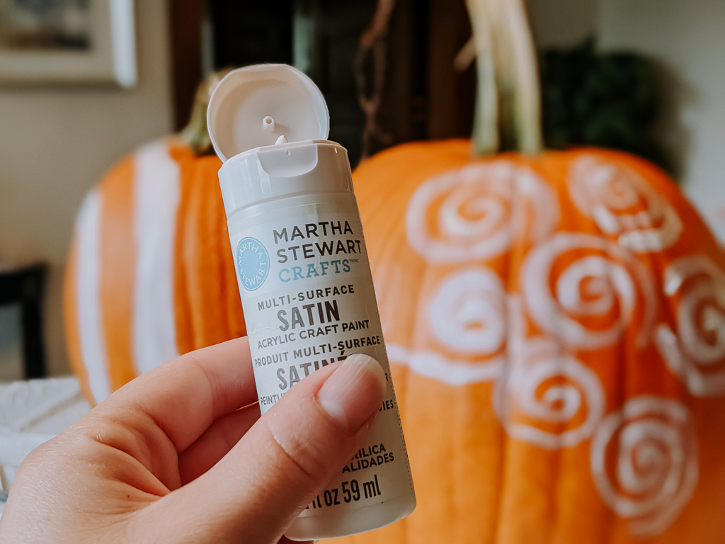 You can use any acrylic craft paint for this project. My personal favorite is from Martha Stewart and features both satin, pearl and metallic finish options. The paint has always performed well and lays on nice and thick, which you definitely need when dealing with pumpkins. I find the paint works best on pumpkins when you don’t cut it much—or at all—with water. I add just a tiny bit to soften it, but no more.