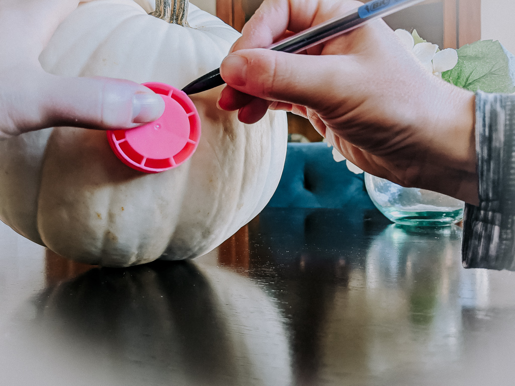 Grab a circular object (I used a bubble container cap). You could also use coins for smaller dots or a milk cap. Using your pencil, trace evenly spaced circles all around your pumpkin. Make sure your extend the the dots to the top and bottom too. Otherwise, it won’t look complete.