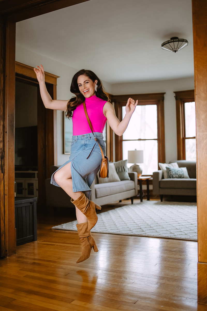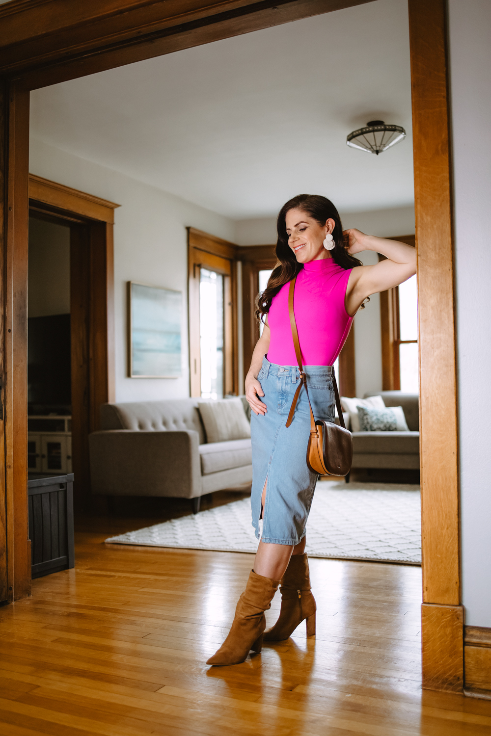 Mock Neck Bodysuit | Denim Skirt | Crossbody Bag | Boots