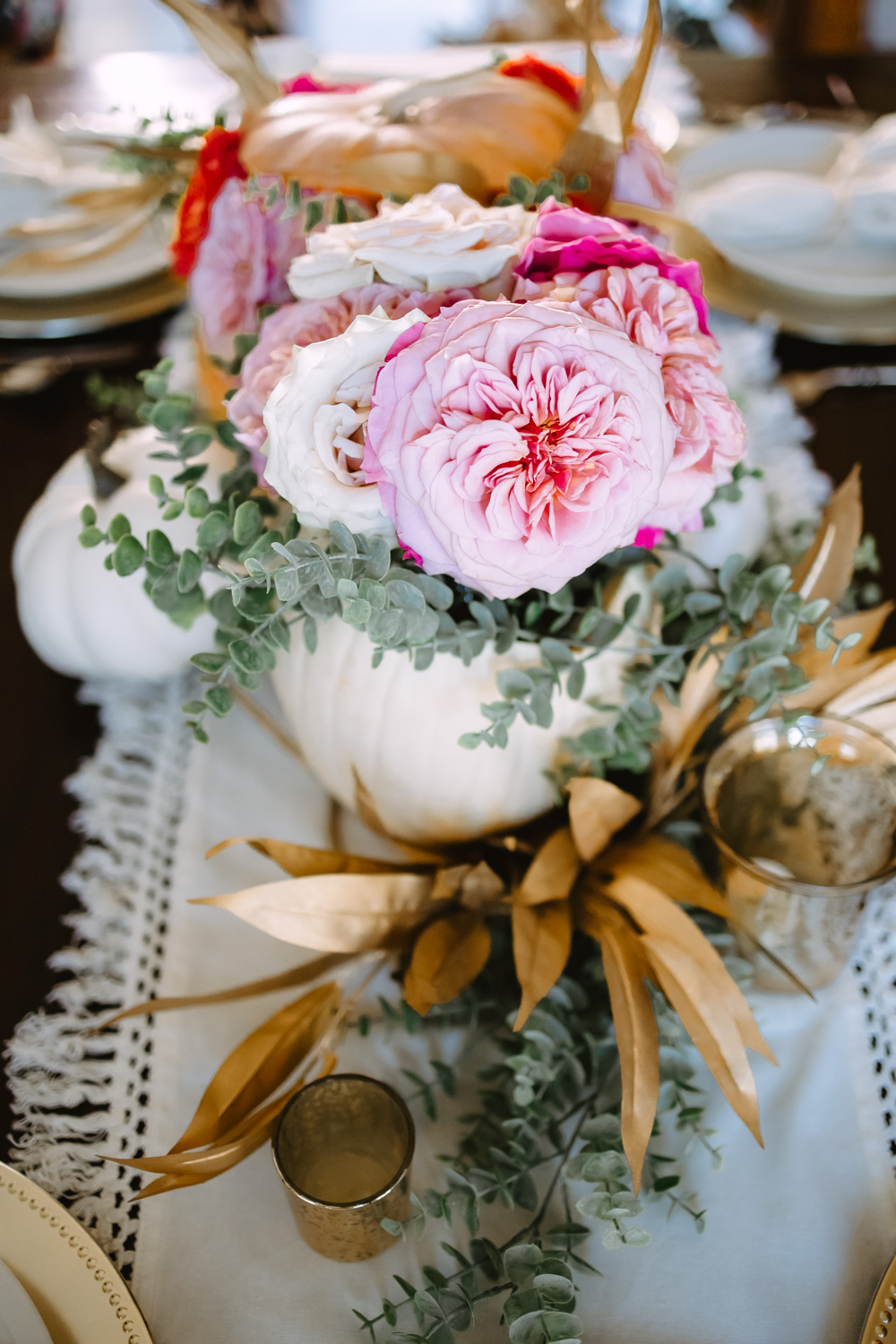 Next, I arranged some gold leaf faux florals and eucalyptus stems for a base. Place your pumpkin floral centerpieces on top, working in some smaller gourds or petite pumpkins for balance.
