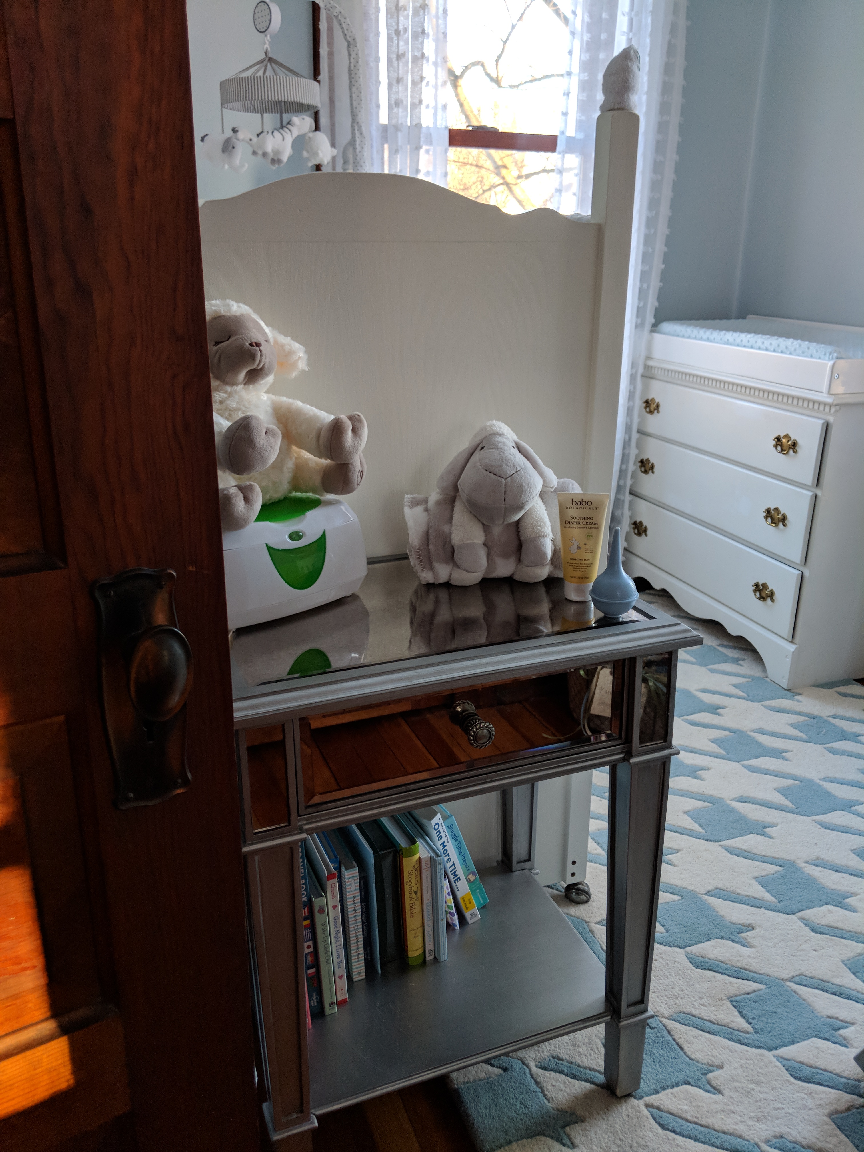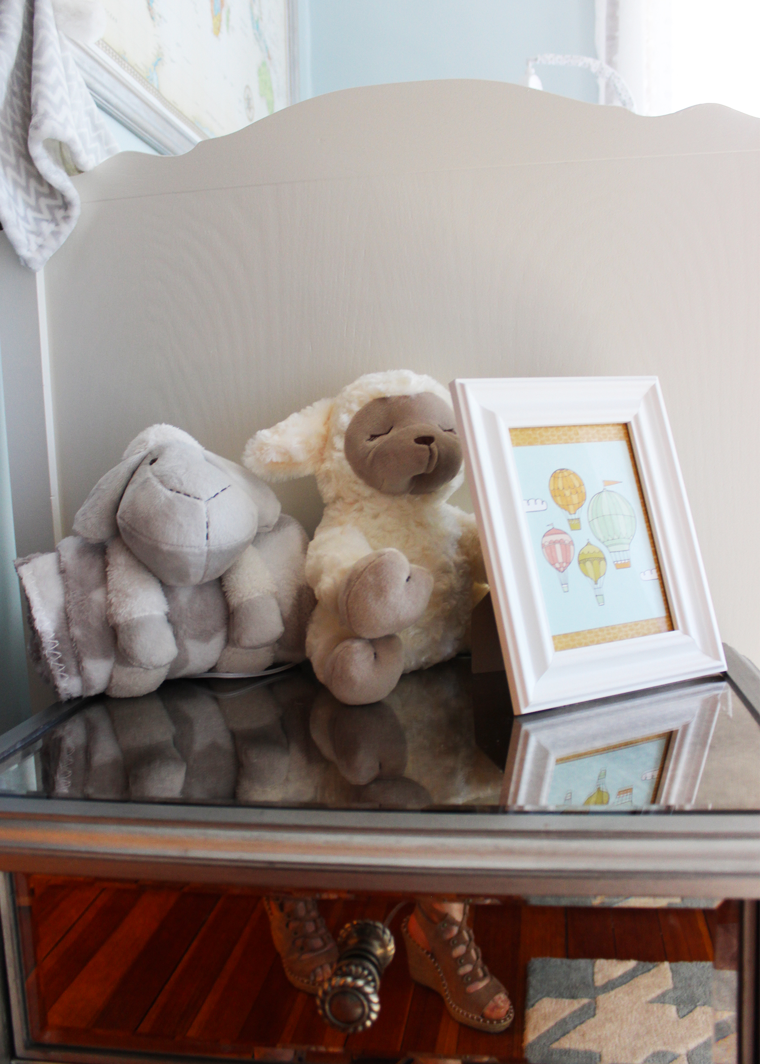 We also added a very small mirrored nightstand from Pier One’s Hayworth collection (gorgeous) in front of the crib. It’s perfect for storing Hudson’s books, diaper cream and stuffed animals. I love how it reflects light and makes the room feel larger. Plus, it can easily transition to your master bedroom or a guest room when baby grows up. Best of all it’s marked WAY down ($269.99 to $199.99). The dresser is an old family heirloom (it was in my room as a baby). By adding this changing table topper from Wayfair, you can combine storage with functionality. It can affix to any dresser, saving you money, if you have one you can repurpose. I like that the topper looks like it is part of the existing dresser. We purchased our topper from Babies R’ Us, so I liked a different option from Wayfair.