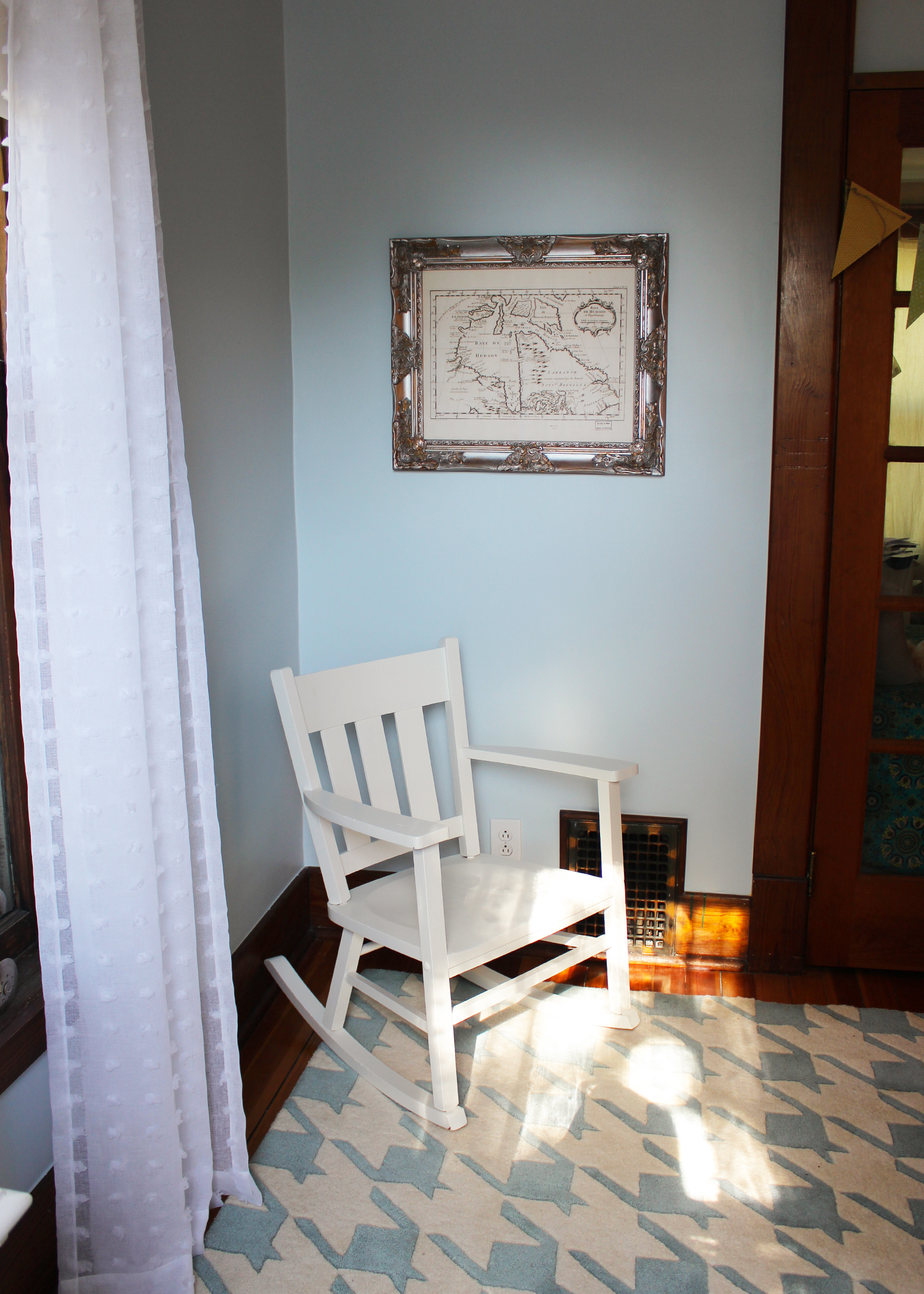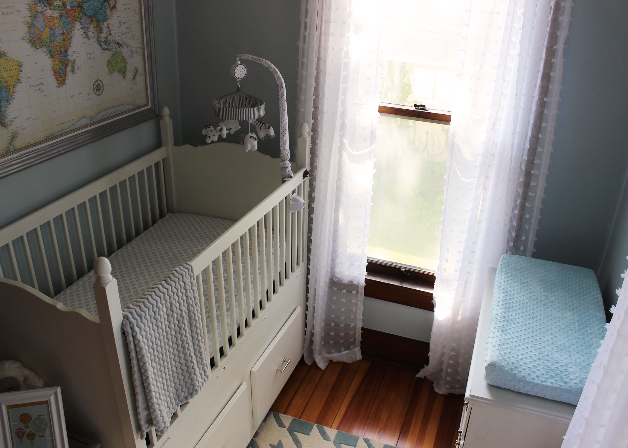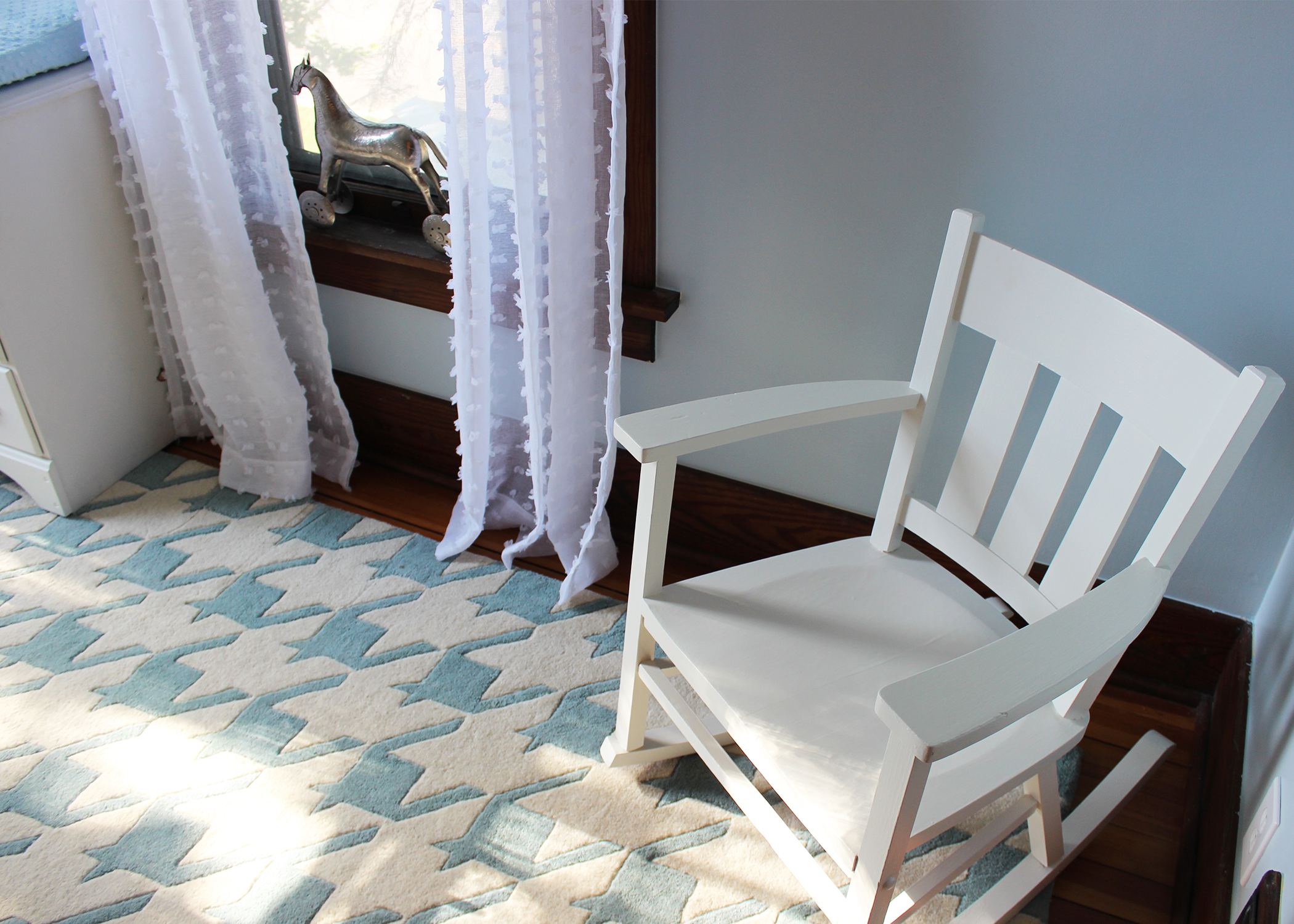 The crib is a family heirloom. It’s a great design, with built in storage underneath, but needed a facelift. I decided to paint it white to give the room a more open feel. We rounded out the nursery with light gray and ocean blue bedding and this cute mobile from Target, again in light gray. The hounds tooth rug we found on Overstock. It’s by our favorite rug maker Safavieh. Their products always feel thick and plush under your feet.